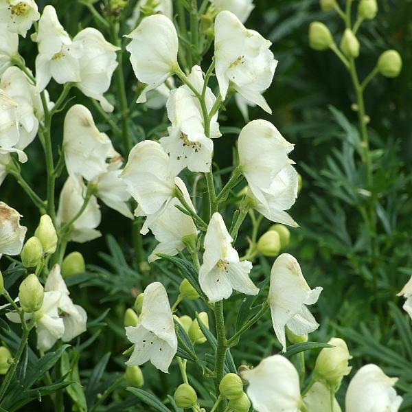 Саженцы Аконита (Борца) клобучкового Альбум (Album) привлекательны внушительными размерами, неприхотливостью и универсальностью. Травянистый многолетник одинаково хорошо растет на солнце и в тенистом цветнике. На прямостоячих прочных стеблях, высотой до метра, распускаются многочисленные белоснежные цветочки удивительной формы: верхние широкие лепестки соединены в подобие капюшона, нижние остаются раскрытыми. Размер каждого бутона не превышает 3 сантиметров. Цветение обильное, с июля по конец сентября. Размещая цветок в саду, необходимо помнить, что аконит ядовит. Растение зимостойко, но нуждается в плодородной почве.