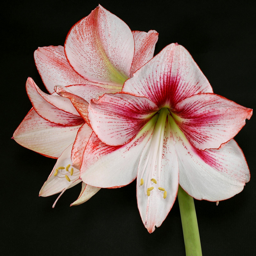 Амариллис простой шоумастер - это великолепное растение с заостренными лепестками и ярко-зеленым горлом, украшенным темно-красным кольцом. На лепестках цветов можно увидеть венозный рисунок и тонкую красную кайму, что делает этот сорт особенно привлекательным. Высота растения может достигать 50-70 см, а размер цветка равен 20 см. Листья имеют интересную форму, что добавляет декоративности этому растению.