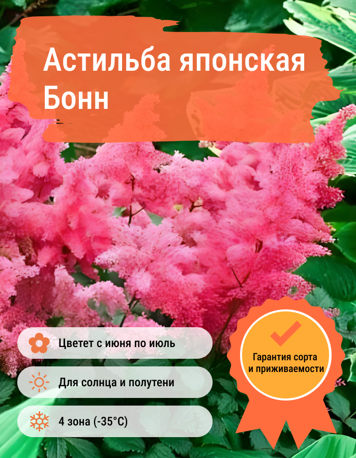 Рассада астильбы «Бонн» (Bonn) вырастает до 70 сантиметров в высоту. Высаживать предпочтительнее на полузатененные места либо на солнце, только тогда в жаркие дни ее нужно прикрывать. Также для семян астильбы «Бонн» нужно выбирать места у водоемов или с хорошо увлажненной почвой. Грунт должен быть еще рыхлым и питательным. Цветение начинается в июне и длится месяц. На верхушках веточек образовываются пышные соцветия из мелких цветочков темно-карминово розового цвета. Используют цветы из рассады астильбы «Бонн» для создания цветников, клумб и групп с декоративными хвойниками.
