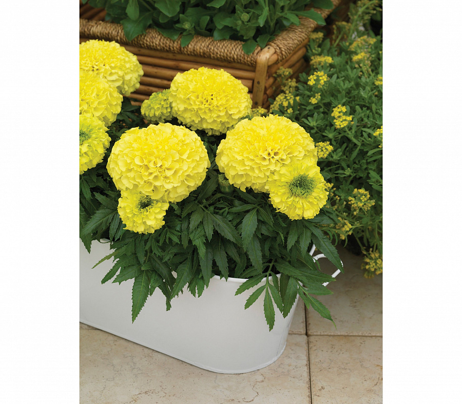 Бархатцы прямостоячие антигуа примроуз - это удивительное растение с лимонно-жёлтыми цветками, которые напоминают лучи солнца в вашем саду. Этот сорт бархатцев отличается своей прямостоячей формой и компактным размером, достигая высоты до 30 см и диаметра до 10 см. Листья этого растения имеют ярко-зеленый цвет, создавая красивый контраст с яркими цветками.