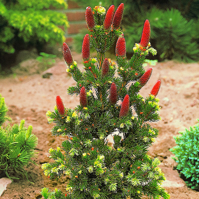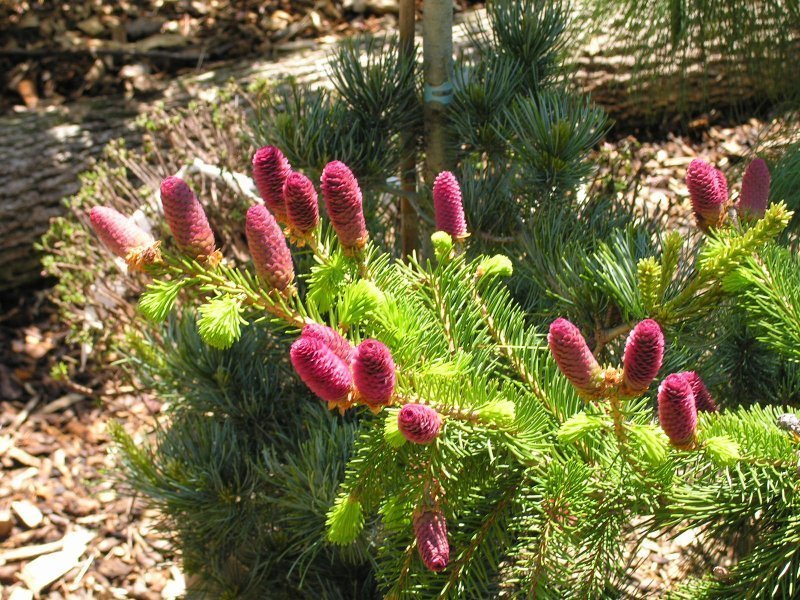 Саженцы Ели колючей Лаки Страйк (Lucky Strike) – маленькое медленнорастущее дерево, у которого крона неправильной формы конуса. Длина около 2х метров. Ель имеет щетинистую, глянцевую, хвою темно-зеленого окраса, длина которой 2-3- сантиметра. У растения изогнутые ветви и большие лилово-красные шишки, которые позже становятся коричневыми.