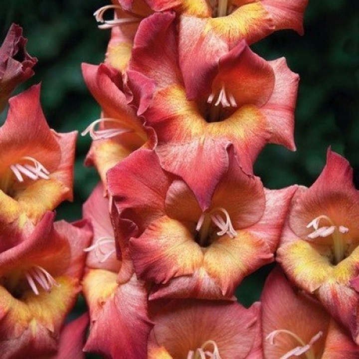 Луковицы гладиолуса Бамбино Мишель ‒ яркие многолетние цветы для оформления клумб и дачных участков, а также для выращивания под срез. Кусты могут достигать до 60‒90 сантиметров в высоту, поэтому подойдут для формирования живых изгородей. Период их цветения наступает в конце лета, в это время они приобретают наиболее декоративный вид. На длинных цветоносах формируется до 8‒10 бутонов. Лепестки махровые, отличаются необычной расцветкой. Они кирпично-красные вдоль края и светло-желтые в центре. Растение эффектно смотрится в объемных праздничных букетах и хорошо хранится после среза.