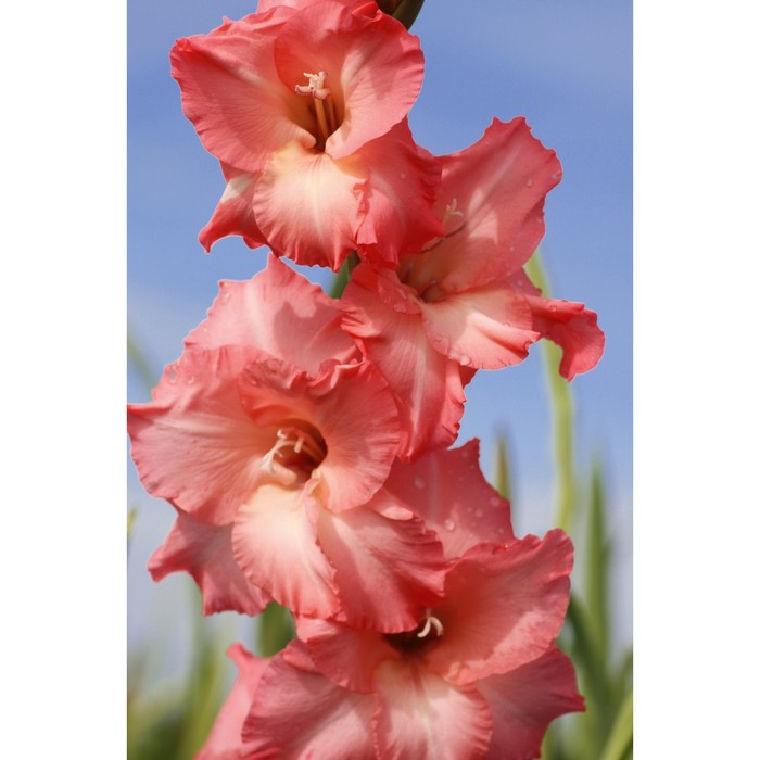 Луковицы гладиолуса гибридного Monica следует высаживать на хорошо освещенные, защищенные от ветра участки. Почва растениям подходит любая достаточно дренированная. Уход заключается в умеренном увлажнении, рыхлении грунта, прополке от сорняков. Взрослые культуры в высоту достигают до 100-150 см. Стебли прямые, прочные. Листья линейные или мечевидные, длиной до 80 см. Цветочки светло-розовые со светлым центром. Они собираются в пышные колосовидные соцветия. На каждом цветоносе одновременно по 8-10 бутонов. Используют гладиолусы гибридные Monica для выращивания в саду и на срез.