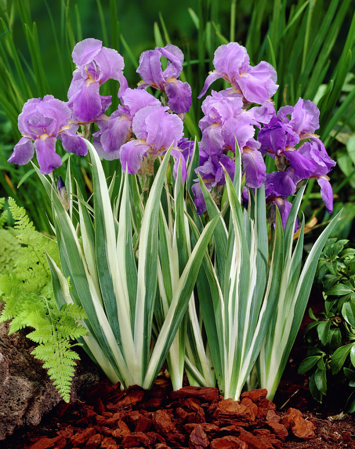 Рассада ириса Ауреваригата (Aureovariegata) доступна уже многие годы, но неизменно пользуется спросом у садоводов. Растение достигает в максимуме 30-50 сантиметров. Эффектна окраска листьев — зелёные, с продольными золотисто-жёлтыми полосками. Цветонос высотой до 80 см, в верхней части ветвится на много бутонов. Цветы от тёмно-синего и фиолетового до сиренево-голубого оттенков, появляются в мае-июне. Для соблюдения чистоты вида желательно при размножении не пользоваться семенами, для чего их предварительно срезают. Ирис Ауреваригата нуждается в солнечном свете. Тяжело приживается как в пресыщенных влагой почвах, так и в засушливых. Наиболее удачный вариант — плодородные, хорошо дренированные почвы с естественной влажностью. Часто применяется для оформления берегов малых водоёмов.
