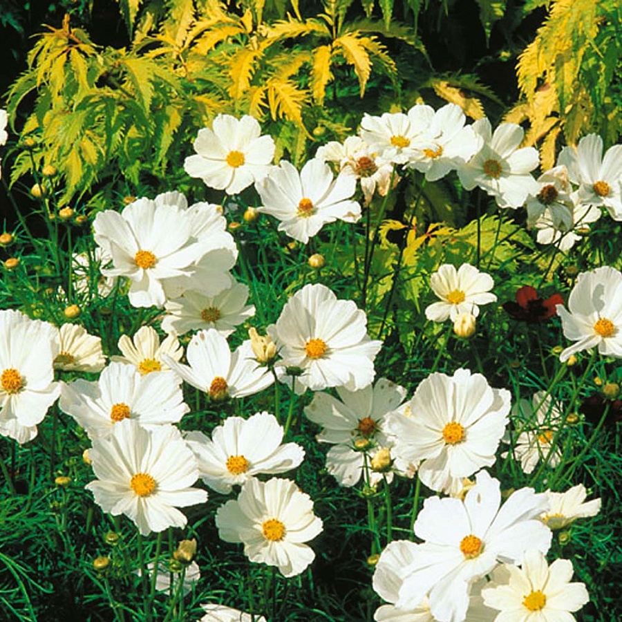Космея Соната Вайт - это великолепное растение с белыми цветками, которое поражает своей изящностью и нежностью. Ее стебли прочные и прямостоячие, достигают высоты до 60 см, что делает ее идеальным выбором для групповых посадок. Листья космеи имеют интересную форму и создают уникальный вид растения.