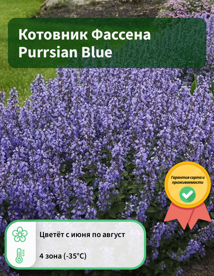 Саженцы Котовника Фассена Purrsian Blue (Nepeta faassenii) является миниатюрным сортом. Растение достигает в высоту и ширину не более 20 см. Листья мелкие, приятного серо-зеленого цвета. Цветки в форме кисточки и имеют нежный сине-фиолетовый цвет. Данное растение лучше высаживать на солнечных пространствах участка или полутени в умеренно плодородную почву. Цветет Персиан блю продолжительное время – с конца июня и до начала сентября. Поливать лучше всего в сильно засушливую погоду, а подкармливать два раза за сезон минеральными удобрениями. Котовник морозостоек и подойдет для посадки вдоль дорожек или аптекарского огорода.