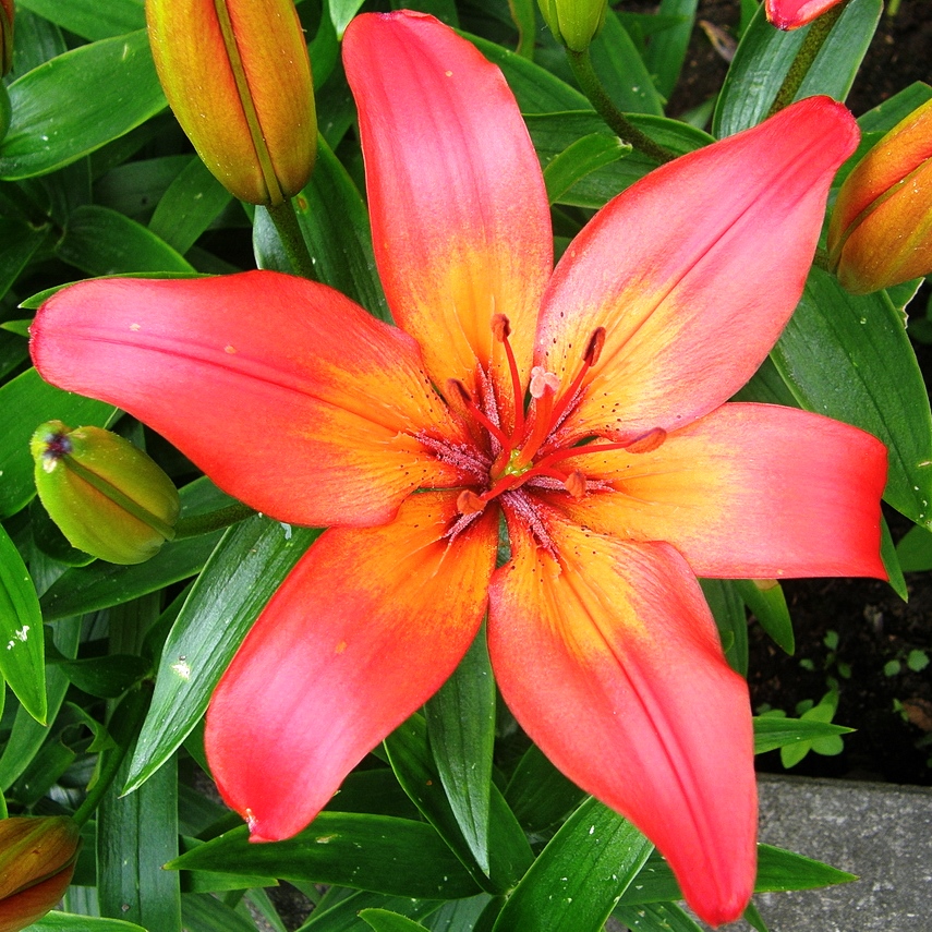 Луковицы азиатской горшечной лилии Матрикс (Lilium asiatic Matrix) привлекают внимание двухцветной окраской. Формируют прочные, утолщенные, густооблиственные стебли высотой до 45 см. Цветки крупные, диаметром около 15 см. Лепестки красные, с оранжевым центром. Тычинки терракотовые. Зацветают в июне и июле. Лилии выращивают в открытом грунте и в кашпо. Цветут обильно при условии размещения на освещенных участках и при умеренном поливе. Растения не любят влажного воздуха и сильных ветров. Подходят на срез, долго сохраняют свежесть в букетах. Зимостойкие, не боятся вредителей.