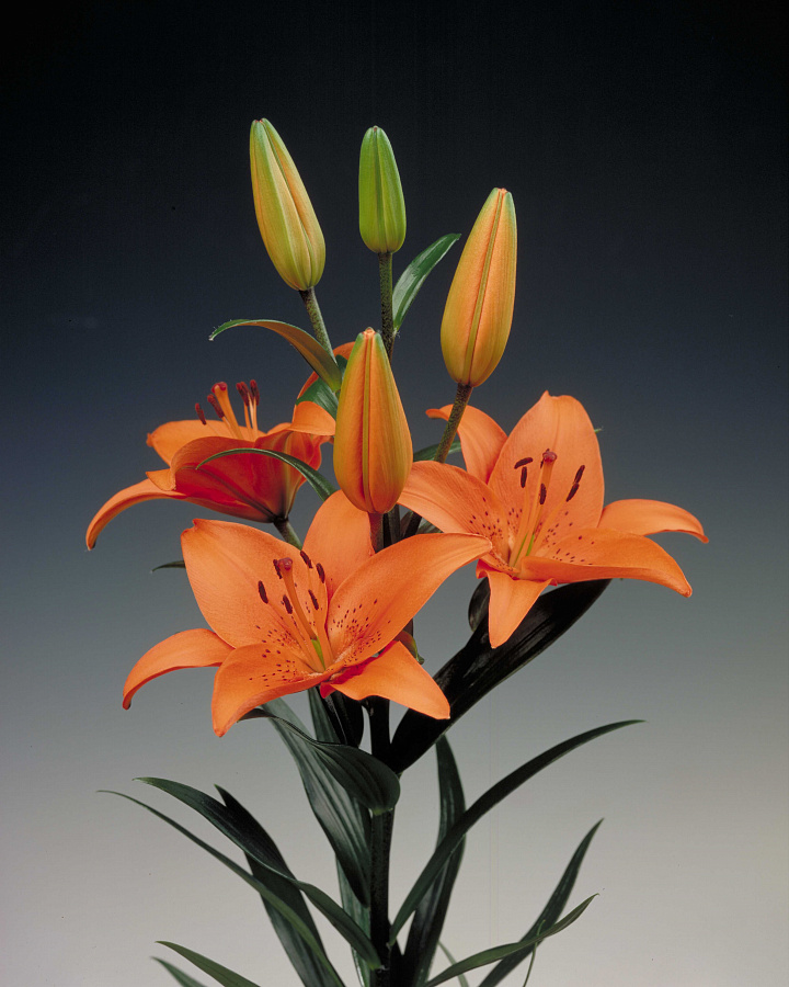 Луковицы азиатской гибридной лилии Трезор (Lilium asiatic hybrid Tresor) привлекают внимание цветоводов яркой окраской. Стебли вырастают до 0,9-1 м в высоту. Диаметр цветков достигает 17 см. Окраска ярко-оранжевая, ближе к центру коричневый крап. Пыльники шоколадные, заметные. Период цветения – июнь и июль. Бутоны гармонируют с темно-зеленой листвой. Лилия хорошо развивается на плодородных, рыхлых почвах. Предпочитает солнце или полутень. Желательно прикрывать от палящих полуденных лучей, под ними цветки быстрее увядают. Сорт в групповых посадках делает огненные акценты. Подходит на срезку.