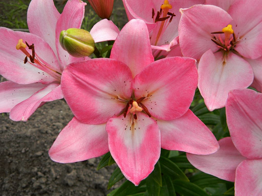 Окраска цветка : Перламутрово-розовая с белым центром, темно-розовые пыльники и редкий мелкий крап у основания
