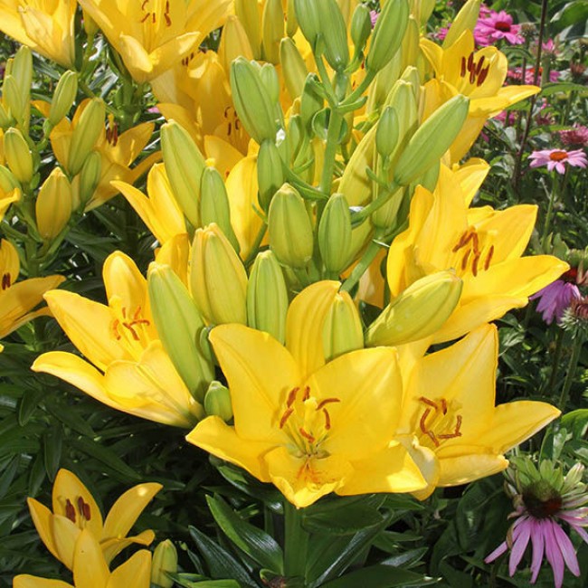 Луковицы Лилии ЛА-гибрид Голден Тайкун (Lilium LA-hybrid Golden Tycoon) воплотят в жизнь мечту цветоводов о ярких, неприхотливых, высоких цветах на садовом участке. Крупные цветы лимонно-желтого оттенка распускаются на стебле, способным вырасти выше метра в высоту. Насыщенный цвет смотрится еще более ярко, благодаря контрастным коричневым тычинкам. Изящества добавляют лилии чуть загнутые кончики лепестков с волнистыми краями. Голден Тайкун, при всей своей аристократичной привлекательности, не потребует от хозяев особого ухода и прекрасно будет чувствовать себя как на солнечном месте, так и в полутени.