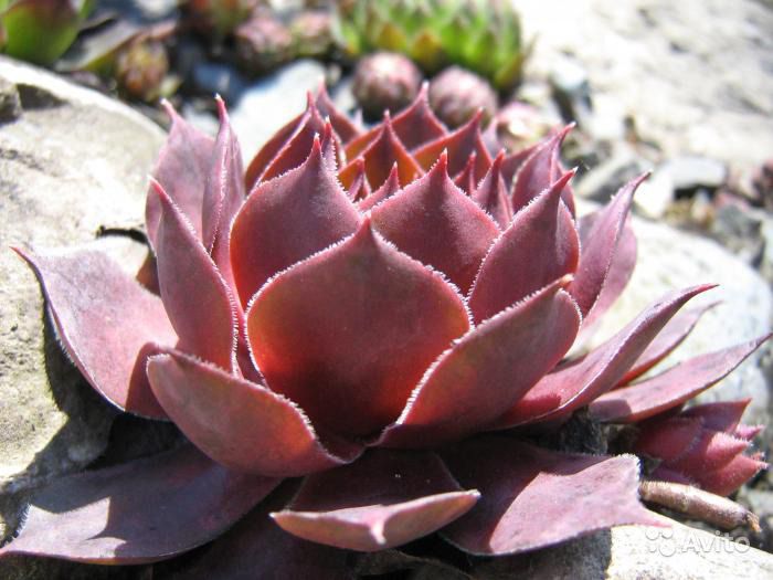 Рассада молодила Пурпуреум (Purpureum) популярен благодаря своим свекольно-красным листьям. Имеет компактный, аккуратный внешний вид и вырастает около 5-10 см в высоту. Цветение преподает на период с июля по август. Достоинства молодила Пурпуреум: