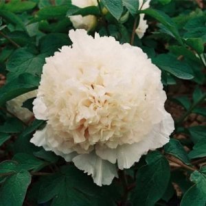 Саженцы пиона древовидного Корона из бисера (Paeonia Suffruticosa) вырастают в роскошный куст с красивыми, словно белоснежные облака, цветками. Кустарник высотой до 1-1,2 метров, ветки раскидистые, листва пышная. Пион предпочитает расти на плодородной дренированной почве и солнечных участках. Кустарник эффектнее смотрится в одиночных посадках. Цветки крупные, диаметром до 16 сантиметров. Лепестки белоснежного окраса, расположены плотно друг к другу, скрывая сердцевину. Зацветает пион в мае. Продолжительность цветения – две недели. Бутоны распускаются одновременно.