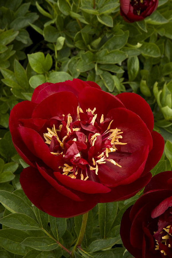 Саженцы пионов Бакай Белл (Buckeye Belle) относится к сорту межвидового гибрида. Куст компактный, высота которого может достигать 60-80 см. Стебли прочные, прямые, листья темно-зеленого цвета, с крупными тычинками. Цветки полумахровые розовидной формы, 5-6 рядные, темного красно-коричневого цвета с крупными желтыми тычинками. Могут достигать в диаметре 16 см. Запах слабый. Саженцы пионов Бакай Белл высаживают на хорошо удобренные солнечные или частично затененные участки. Полив необходим в засушливое время года.