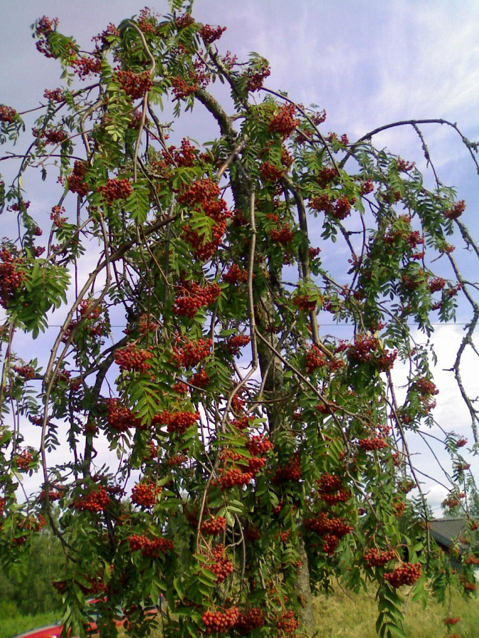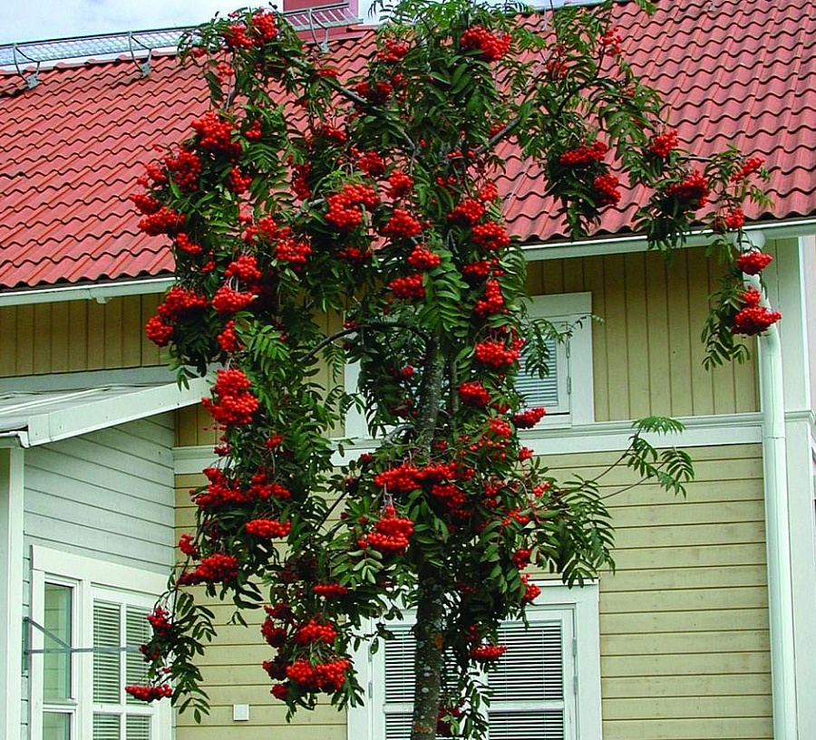 Рябина станет настоящей гордостью сада, ведь необычный вид будет притягивать восхищённые взгляды. Все ветки покрыты резными листочками и элегантно ниспадают к низу. Большие цветы кремового цвета образуют соцветия, получаются крупные шапочки. А осенью созревают яркие красно-оранжевые ягоды. Ветви у дерева легко гнуться и их можно подстричь на свой вкус.