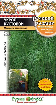 Семена укропа "Русский размер" —  это уникальный и высоко ароматичный сорт. Розетка листьев достаточно мощная. Содержит крупные, сильнорассеченные листья, которые образуют густой и раскидистый кустик. Его ширина достигает до 50 см в диаметре. На протяжении длительного времени на культуре не образуется цветонос. Поэтому зеленая масса очень долго остается нежной на вкус. Ароматность очень высокая. Сорт семян укропа "Русский размер" пригоден для использования не только в свежем виде, но также сушеном и замороженном.