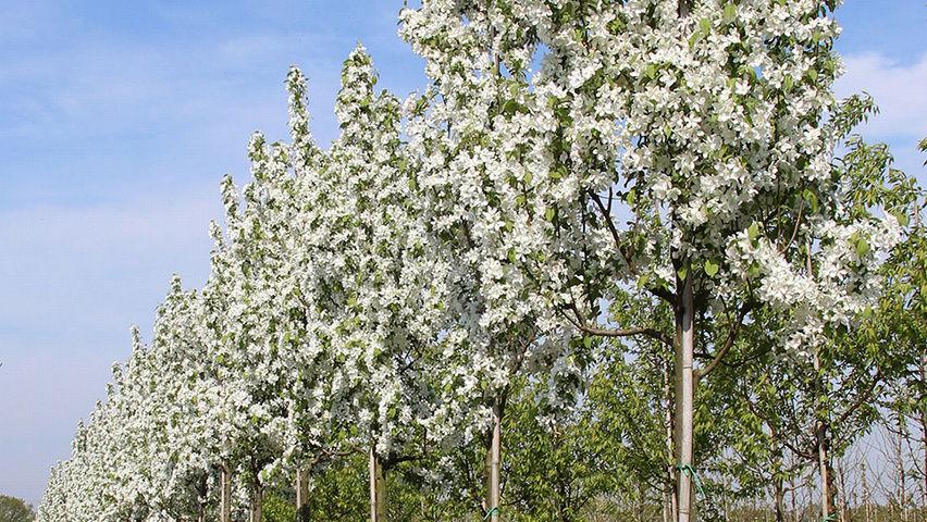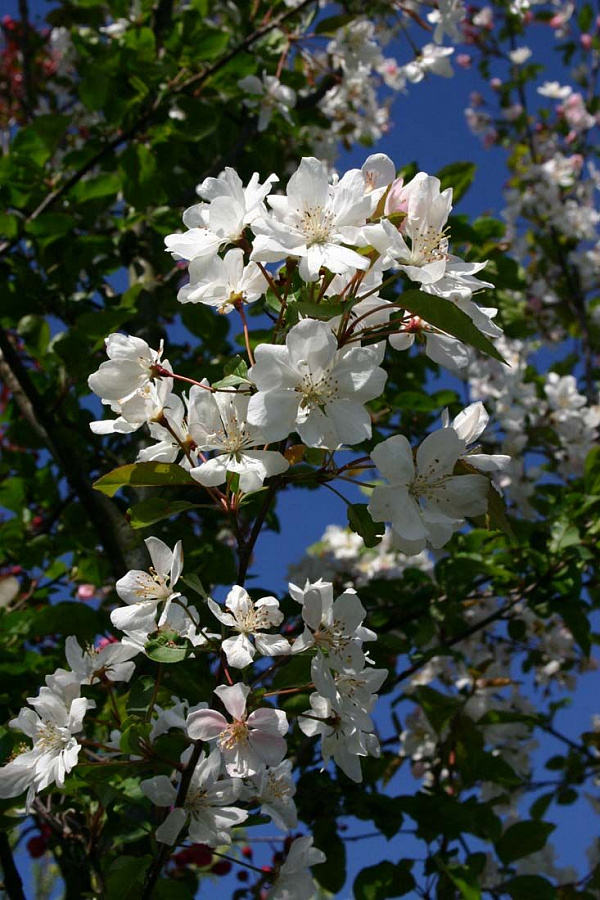 Саженцы яблони декоративной Стрит Парад (Street Parade) часто используются для создания аллей, живых изгородей и высаживаются на заднем плане цветников. Деревья, словно солдаты на параде, растут строго вверх, образуя стройное растение с колонновидной кроной высотой до 5 метров. В мае ветки обильно покрываются розовыми бутонами, а позже - белоснежными цветками, издающими нежный аромат. Плоды темно-красные, мелкие, растут пучками, остаются на побегах до глубокой осени.